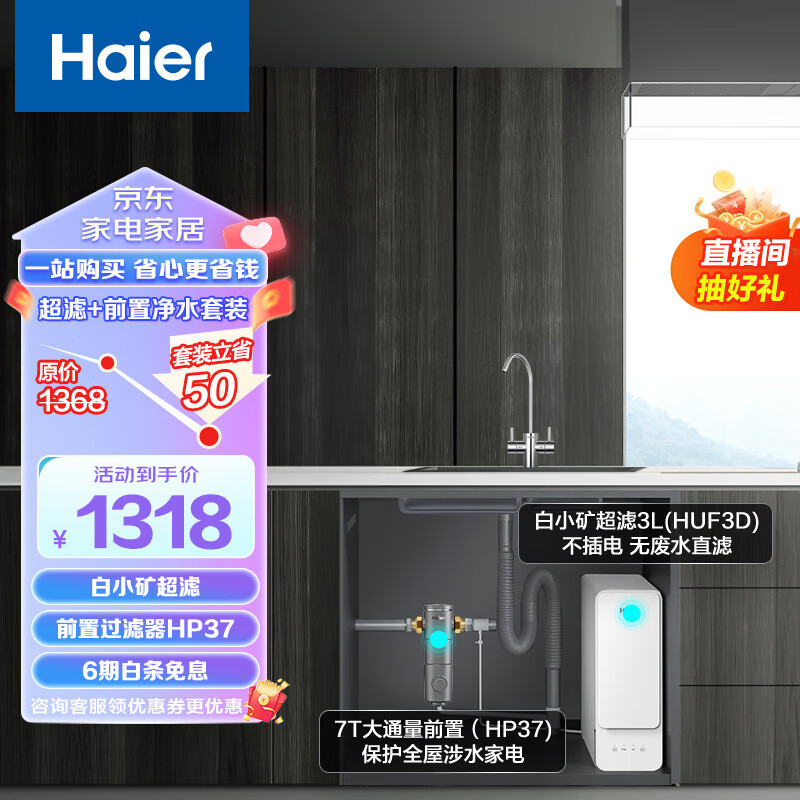 海尔(Haier)超滤净水器家用净水机直滤3L大流量饮用厨下式无桶厨房过滤器白小矿净水器+前置过滤器HUF3D+HP-37价格:1318.00元!