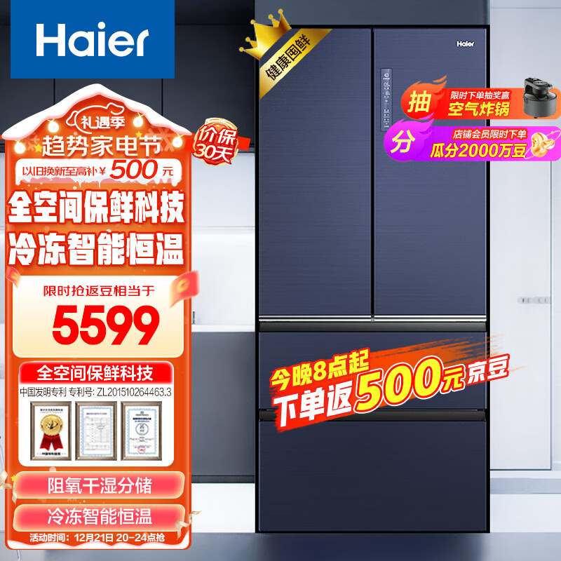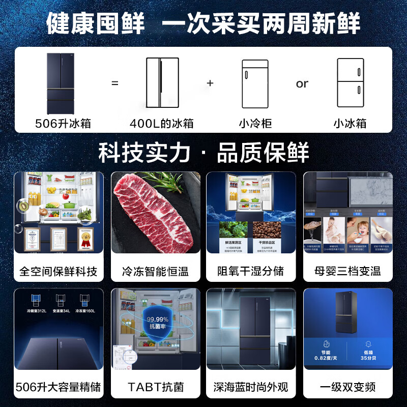 海尔(Haier)506升全空间保鲜科技法式四开门多门电冰箱家用一级能效节能超大容量无霜超薄嵌入式BCD-506WSEBU1价格:6699.00元!