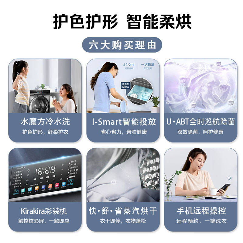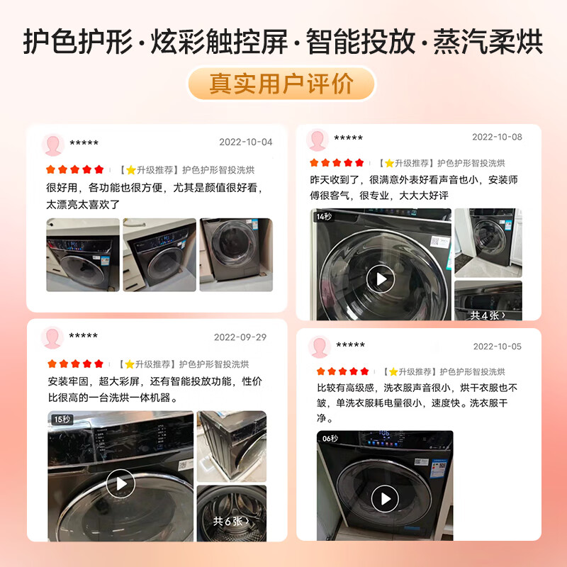 5、外观大气上档次,彩屏颜色好看,机身薄很节省空间。智能投放洗衣液的功能,衣服洗的又干净。容量选的10kg,足够一家四口用
