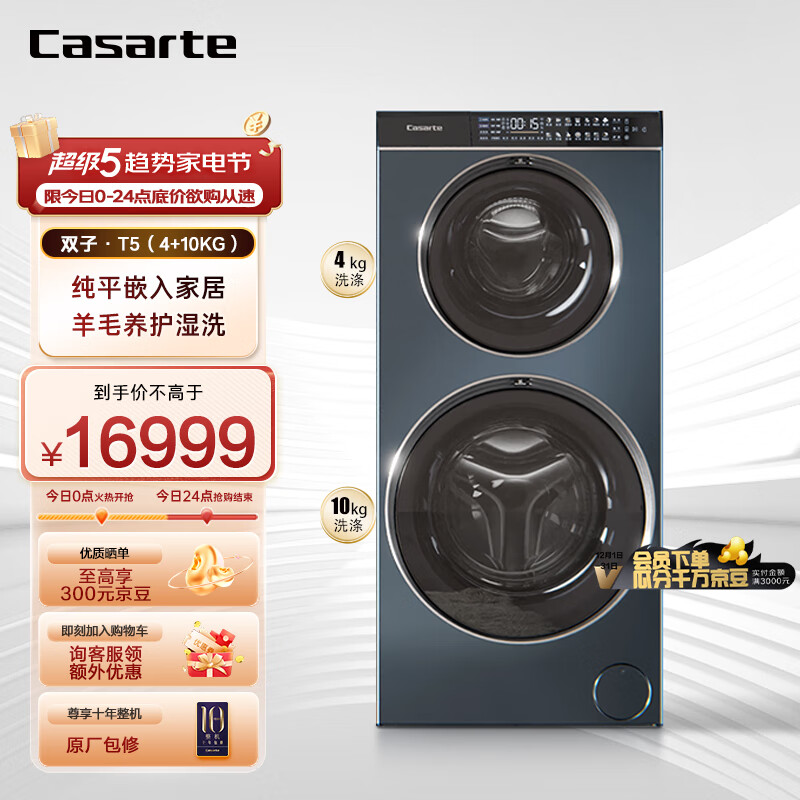 2、听朋友介绍的上下两门卡萨帝洗衣机,半年前在大中买了一台用着不错,想着会这边房子再给配一台,京东上又买了,价格比半年前买便宜了些,主打还是分着洗衣服方便!