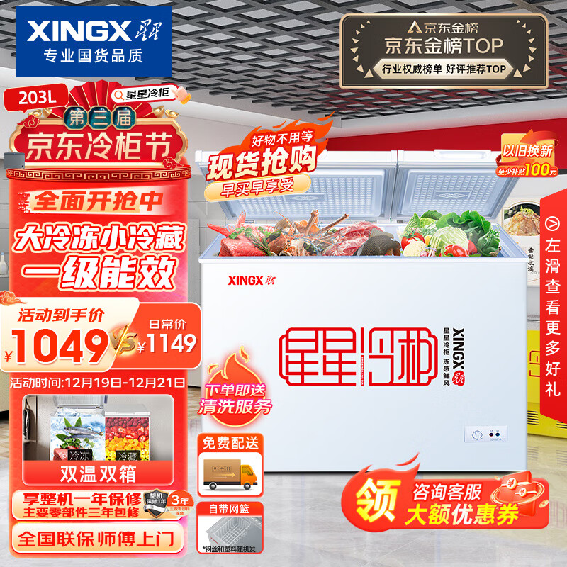 星星(XINGX) 203升 家用商用双温冰柜 双箱冷柜 左冷冻右冷藏冰箱 顶开门大容量 BCD-203EJD价格:1099.00元!