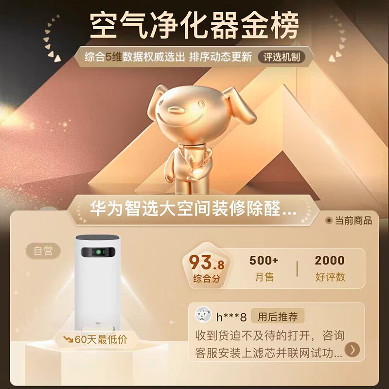 2、很满意的一款空气净化器,功能多,且机子很轻,拆装都很方便,比之前用的大金好用,而且便宜了一大半,打算还要再买一台,性价比很高,华为的东西确实不错的,好评