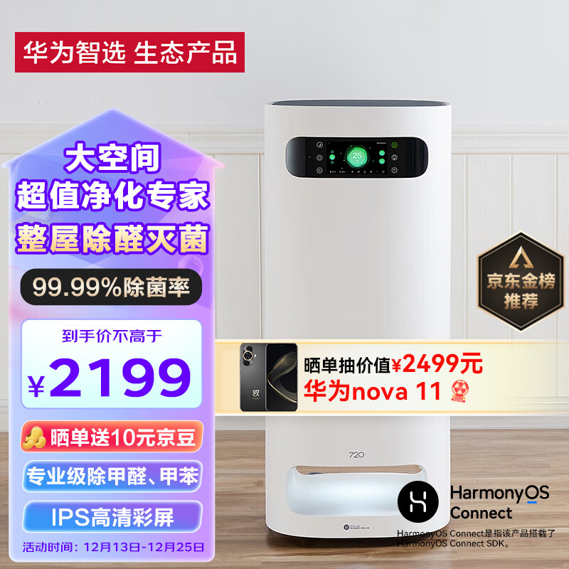 华为智选720空气净化器1PRO 专业级除甲醛双重除菌除异味除过敏原 99.99%消毒性能 家用大空间价格:2199.00元!