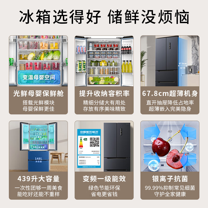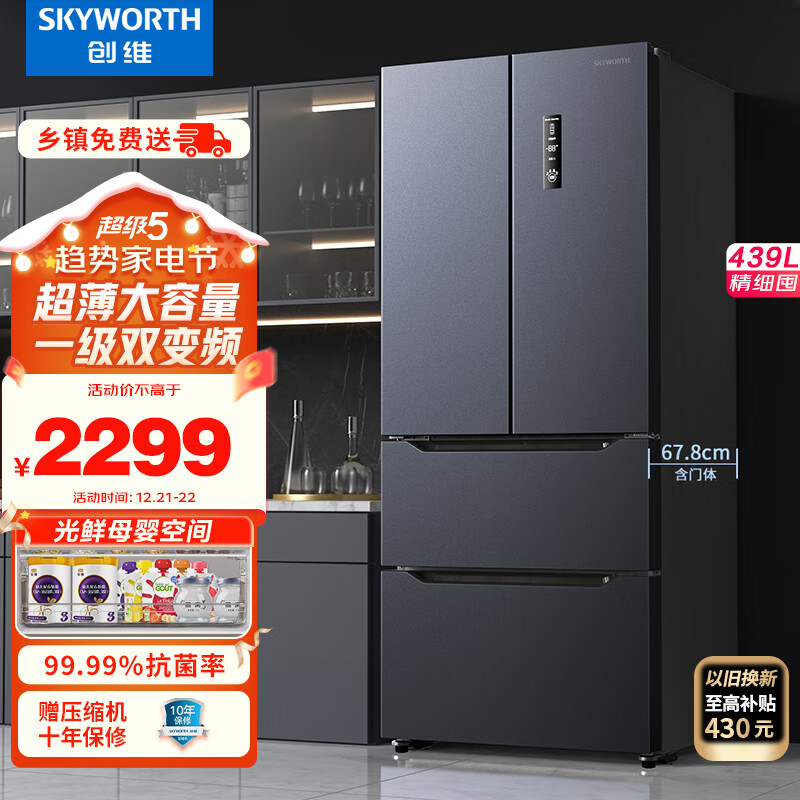 创维(SKYWORTH)【光鲜系列】439升双变频一级能效多门法式家用大容量风冷无霜冰箱超薄 BCD-439W4DB1价格:2299.00元!