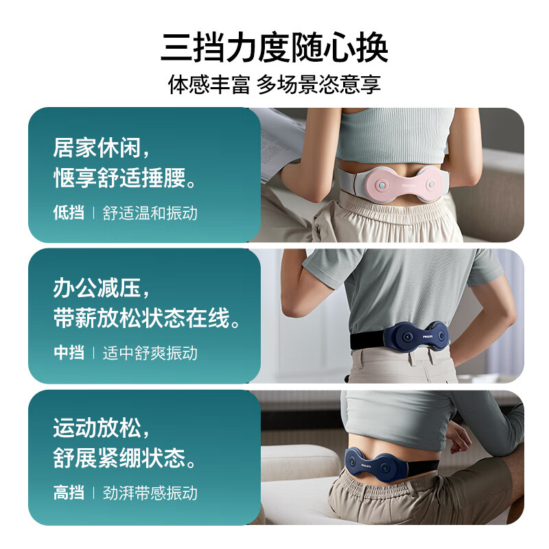 5、飞利浦的腰部按摩器,有4大温控调节功能,有冷热交替使用功能,360度旋转按摩腰部,可以很好地缓解腰椎间盘突出问题,是一款非常实用的保健防护用品!
