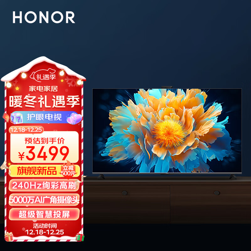荣耀(HONOR)智慧屏5 65英寸 240Hz绚彩高刷 5000万AI广角摄像头 超级智慧投屏 莱茵认证无频闪护眼 HN65TAG价格:3499.00元!
