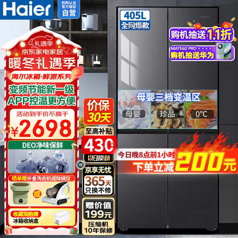 海尔(Haier)冰箱鲜派405升十字四开门风冷无霜超薄家用大容量净味APP控温双变频新一级节能BCD-405WLHTDEDS9U1价格:2898.00元!