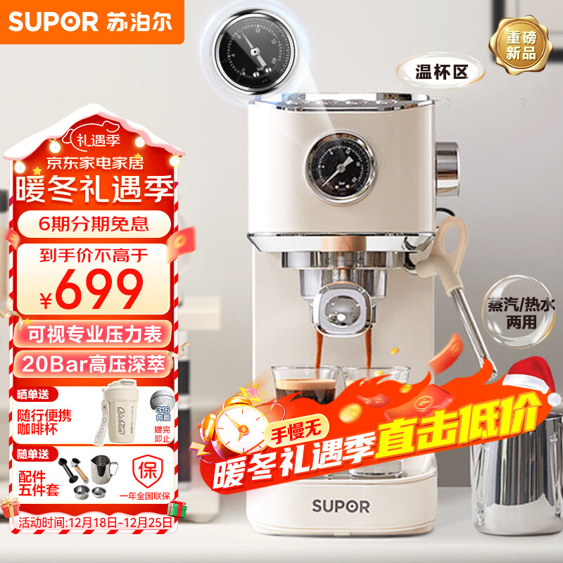 苏泊尔(SUPOR)意式家用浓缩萃取半自动咖啡机 办公室商用小型便携式摩卡手冲咖啡壶 全自动美式打奶泡SW-CFB501价格:699.00元!