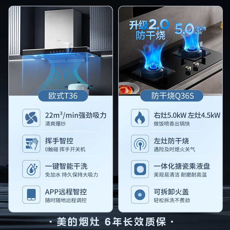 美的(Midea)顶吸欧式抽油烟机 22大吸力 家用厨房油烟机排烟罩 自动清洗 烟灶套装 T36+Q36S(天然气)价格:2499.00元!