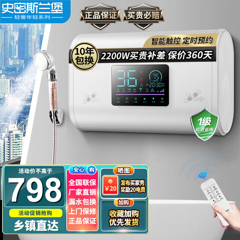 史密斯兰堡储水式电热水器60升扁桶家用洗澡沐浴2200W遥控定时预约变频电脑款+出水断电一级能效DSZF-T07Y60价格:778.00元!
