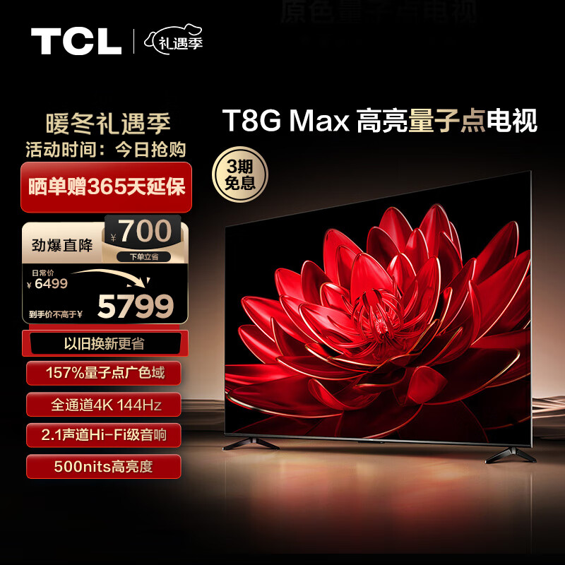TCL电视 85T8G Max 85英寸 QLED量子点 4K 144Hz 2.1声道音响 4+64GB 客厅液晶智能平板游戏电视机价格:5799.00元!