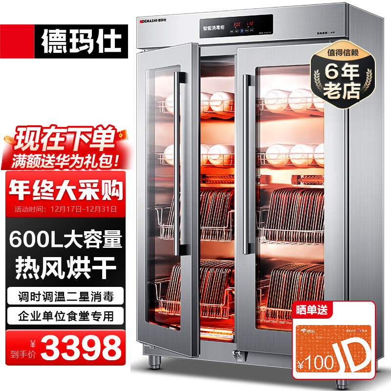 德玛仕(DEMASHI)商用消毒柜热风循环 立式高温双开门 单位食堂餐厅用可调温调时 不锈钢消毒碗柜XDR600-A1价格:3398.00元!