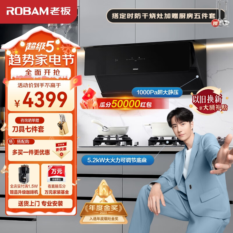 老板(Robam)抽油烟机探索家D3S家用大吸力三面拢烟变频烟机灶具燃气灶烟灶套装23风量吸油烟机28D3S套装价格:4399.00元!