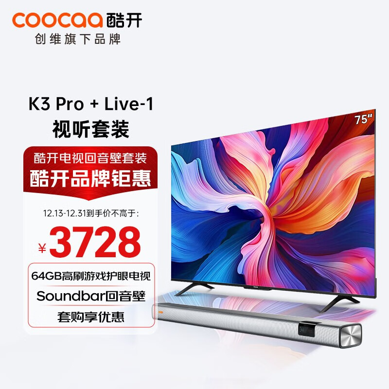 酷开创维 75英寸K3 Pro电视机+音响Live-1 回音壁 客厅家庭影院 壁挂条形音箱 蓝牙影院级娱乐体验套装价格:3728.00元!