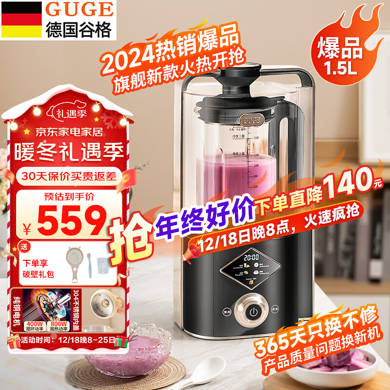 谷格(GUGE)【2024旗舰新款】德国静轻音破壁机家用豆浆机全自动免煮免洗五谷杂粮小型多功能榨汁机果汁料理机 GB658黑1.5L干湿两用冷热磨粉三合一破壁机价格:699.00元!