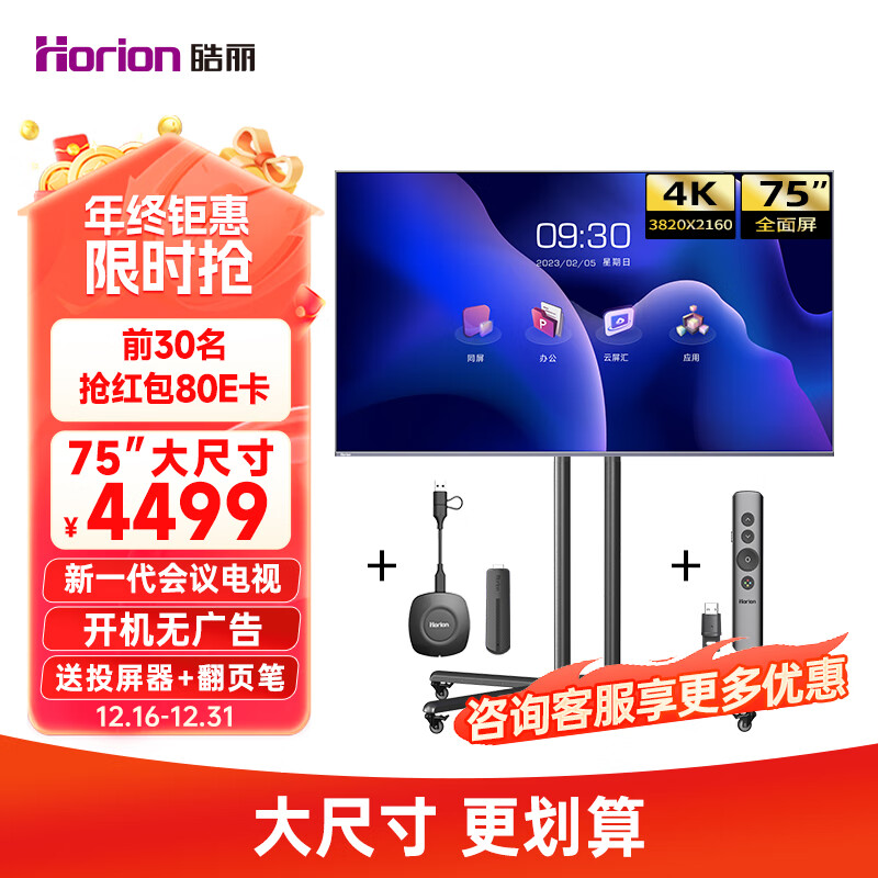 皓丽(Horion)会议电视平板一体机75英寸移动投影电视一体机智慧屏投屏商用显示会议室教学培训大屏75H5套装价格:4499.00元!