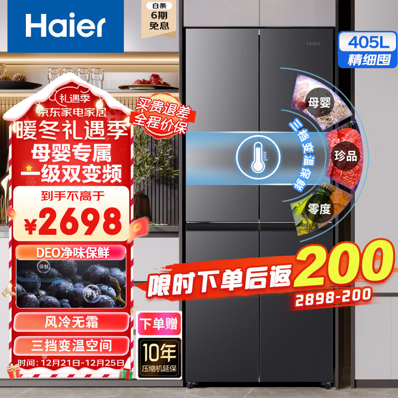 海尔(Haier)405升专属母婴空间冰箱十字对开门多门四门一级能效双变频风冷无霜电冰箱超薄机身智能双变频价格:2899.00元!