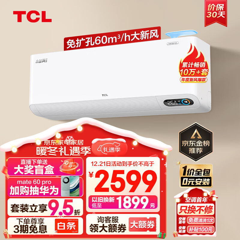 TCL新风空调1.5匹新一级 变频冷暖60m3/h大新风量小蓝翼Ⅱ卧室挂机 KFRd-35GW/D-SWA11Bp(B1)一价全包价格:2599.00元!