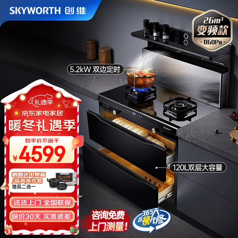 创维(Skyworth)集成灶一体灶 26立方大吸力变频节能 家用抽油烟机燃气灶保洁柜烟灶套装天然气JJZT-J72B价格:4599.00元!