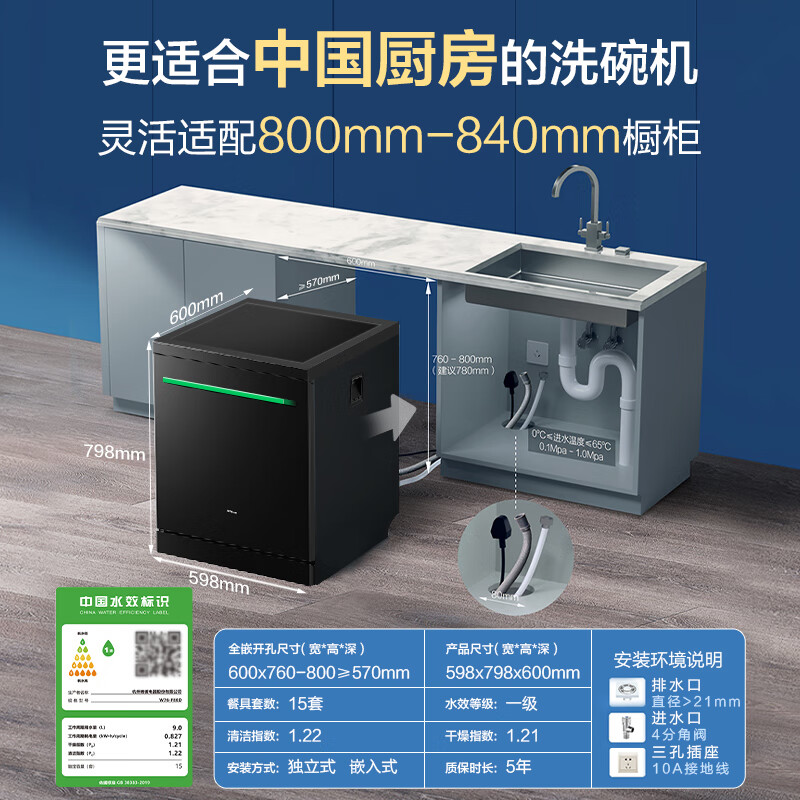2、外形外观:非常漂亮清洁能力:一家五口人,足够使用,大碗小碗,锅碗瓢盆一概清洗,给老妈省了不少力,关键省水还。物流速度:非常快,安装师傅还很给力。总体感觉非常好,为了减轻老妈的家务劳动,非常有必要。点赞。噪音程度:洗碗机声音比较轻,不用担心振东,噪音。