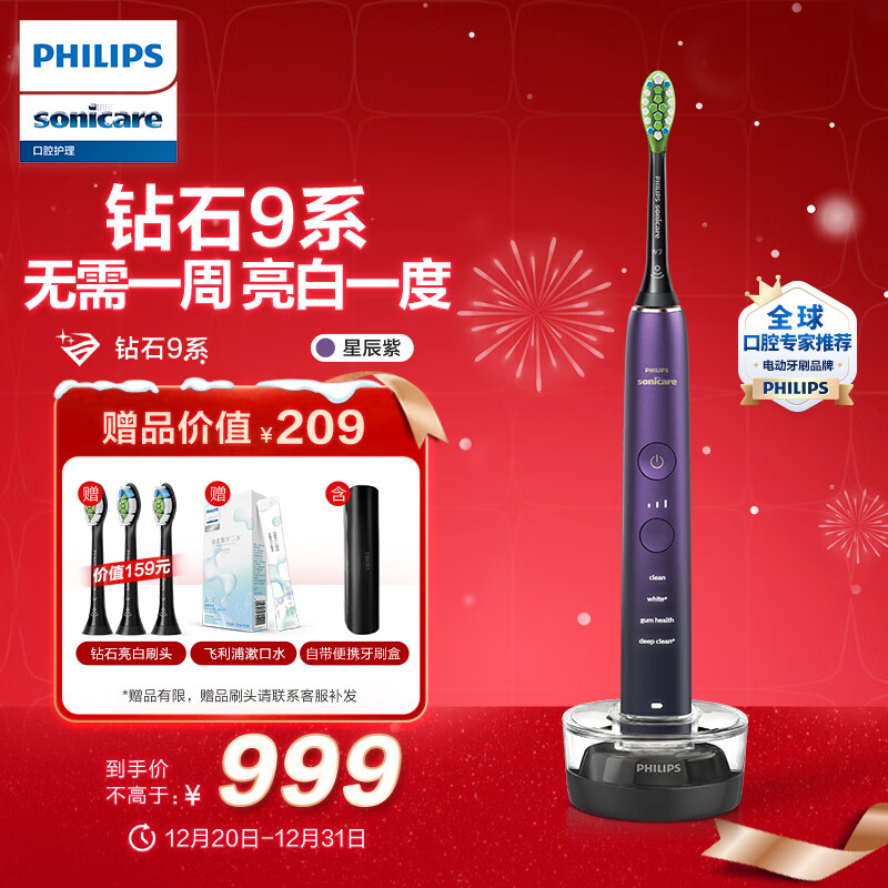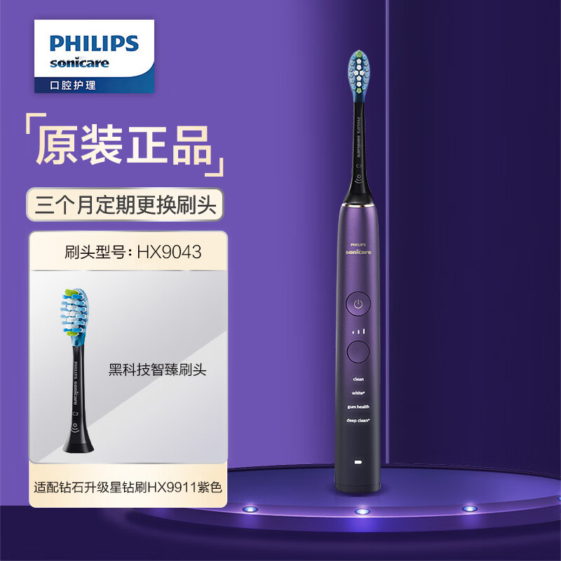 飞利浦(PHILIPS)电动牙刷成人情侣款 圣诞新年礼物 送女友/男友 声波震动 1支刷头 钻石9系 星辰紫价格:1119.00元!