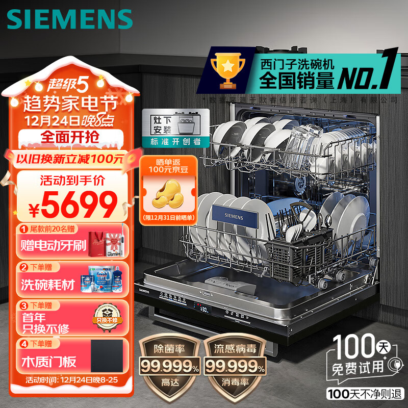 西门子12套灶下大内腔洗碗机嵌入式 除菌消毒一体 一级水效 三重烘干 高700mm SE63HB66KC(黑门板)价格:5699.00元!