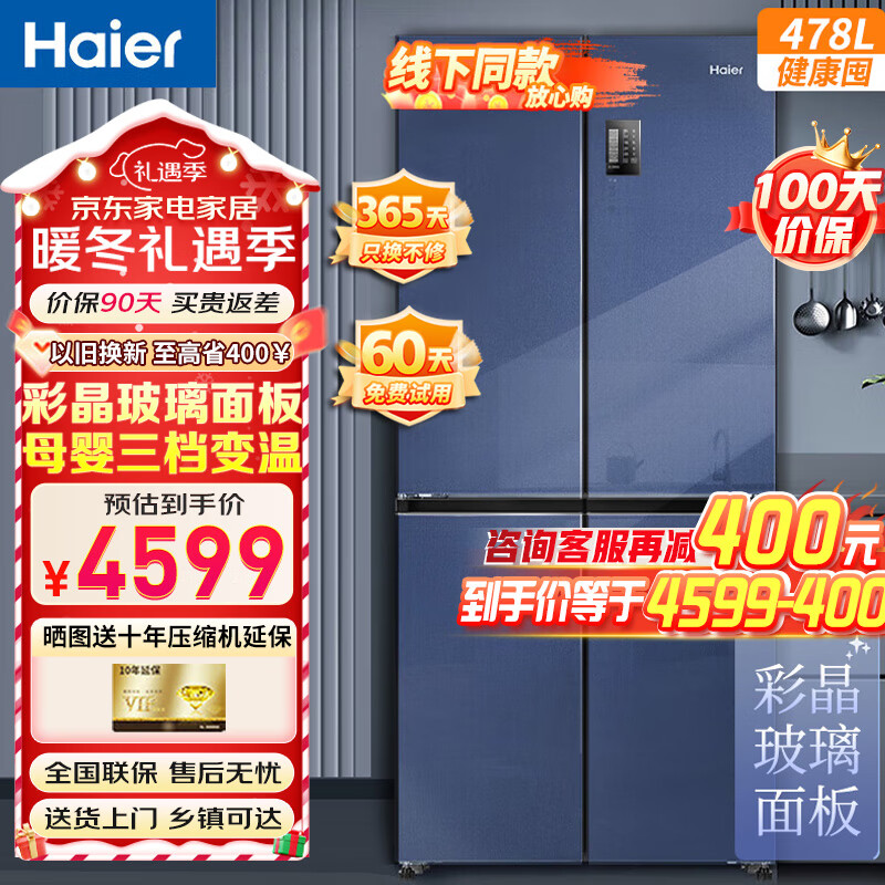 海尔(Haier)478升十字对开门冰箱一级能效变频母婴空间三档变温大容量四开门干湿分储BCD-478WGHTD5DB1价格:4399.00元!
