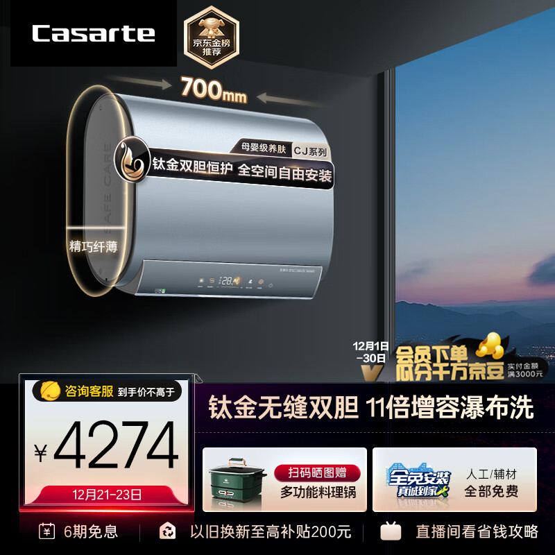 卡萨帝(Casarte)60升储水式电热水器家用超薄扁桶型钛金无缝双胆短款双驱速热一级能效CEC6005-CJ5U1【以旧换新】价格:4499.00元!