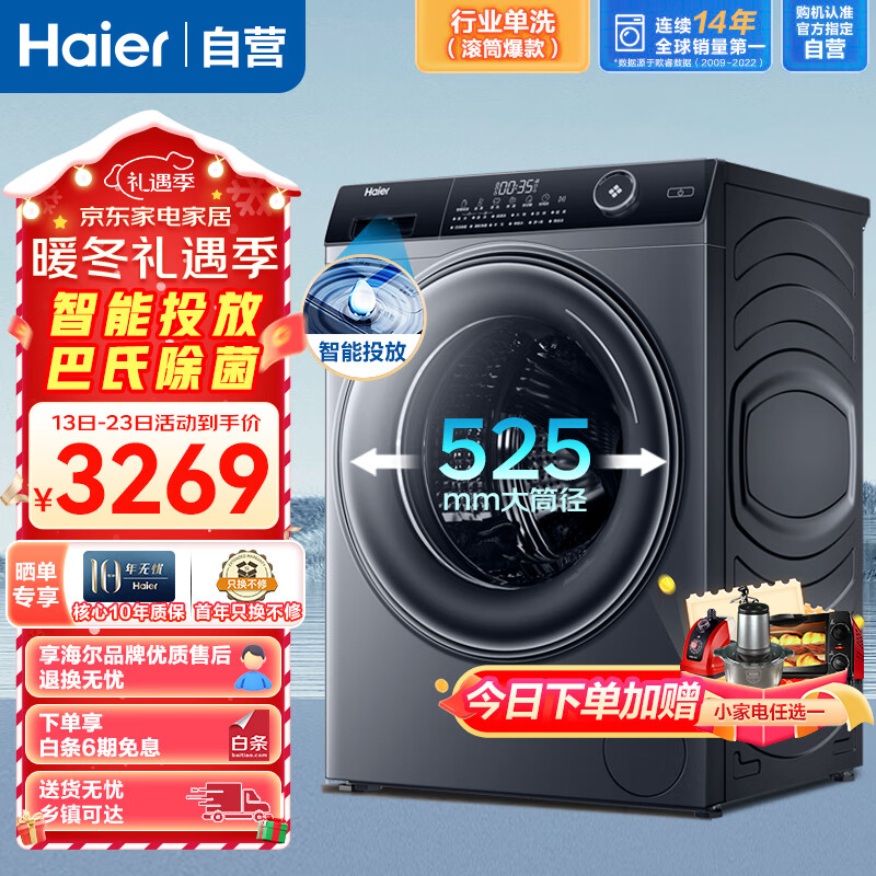 海尔(Haier)洗衣机10公斤滚筒家用嵌入式节能变频洗烘一体空气洗大筒径智能投放巴氏除菌超薄洗衣机HB309价格:3269.00元!