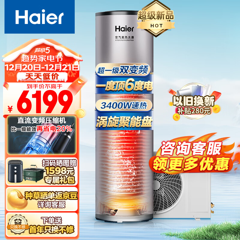 海尔(Haier)空气能热水器200升包安装 超一级能效全变频净水洗 升级R32冷媒 WIFI智控 KF200-T7U1(3-5人)价格:6199.00元!