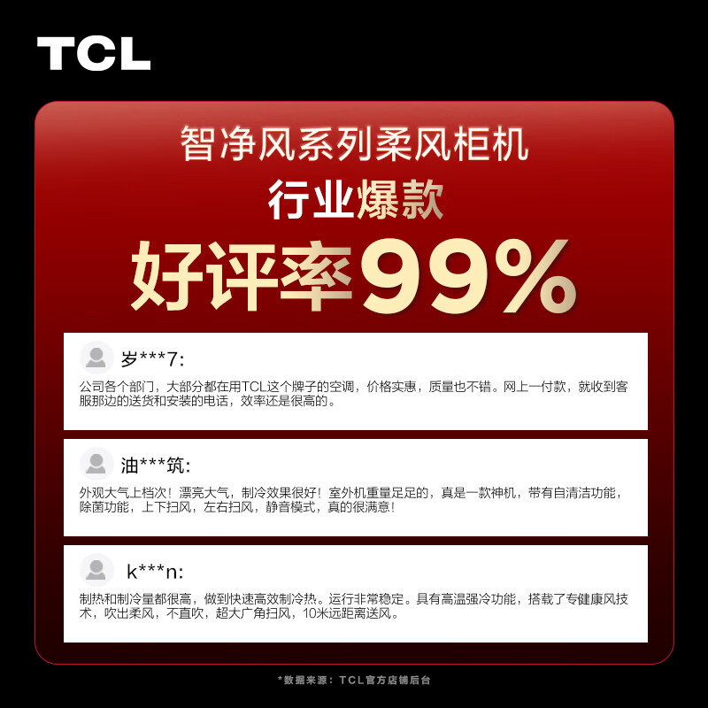 3、第二次买TCL的这款空调了,去年买了一个,今年又购了一台,制冷迅速,噪音小,一级能效,节能降耗,值得推荐。