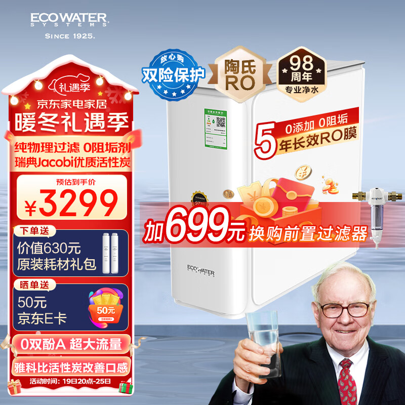 怡口净水(ECOWATER)净水器家用800G厨下母婴直饮长效陶氏膜RO反渗透大流量无双酚A无添加剂新1级水效水晶系列ERO151-3价格:3299.00元!