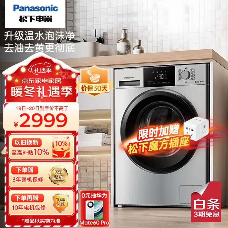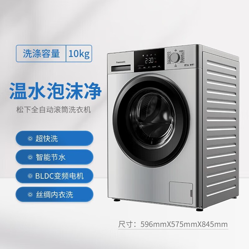 松下(Panasonic)滚筒洗衣机全自动 10KG大容量 BLDC变频电机 智能节水 银色 XQG100-N13S 精选价格:2999.00元!