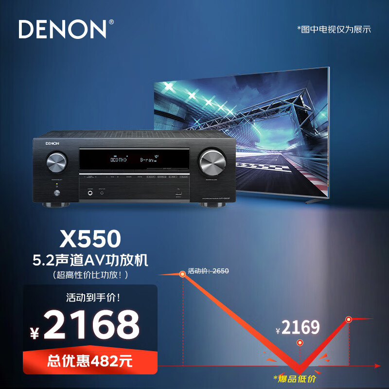 天龙(DENON)AVR-X550BT 音响 音箱 家庭影院 5.2声道AV功放机 支持 4K 杜比 DTS USB 蓝牙 进口 黑色价格:2168.00元!