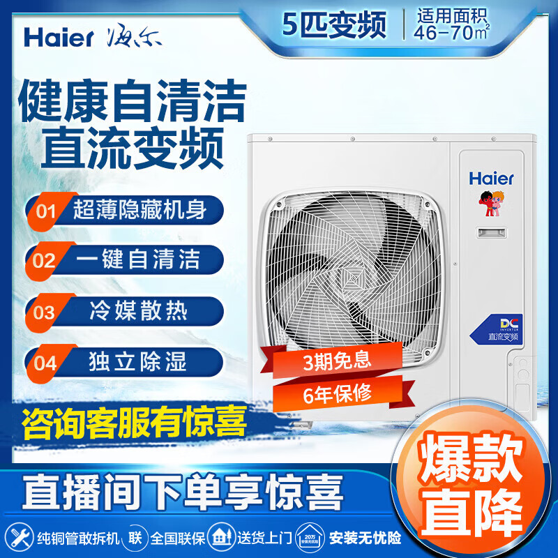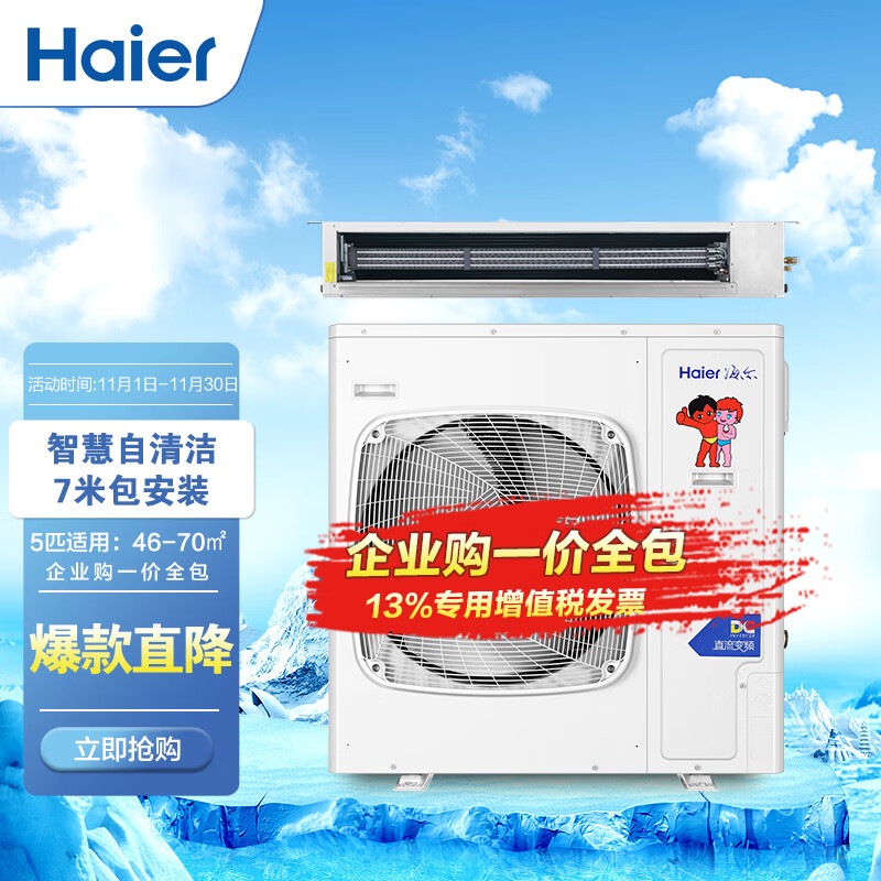 海尔(Haier)风管机一拖一中央空调5P商用5匹变频大风管2级能效健康自清洁380v RFUMDC120DXSAYA 包7米安装价格:8999.00元!