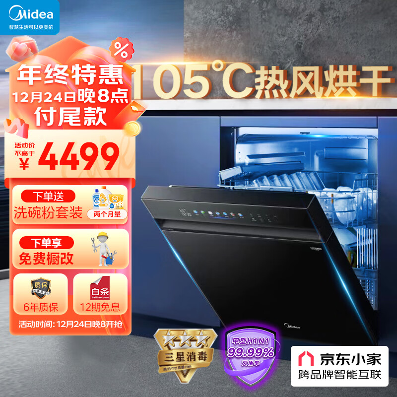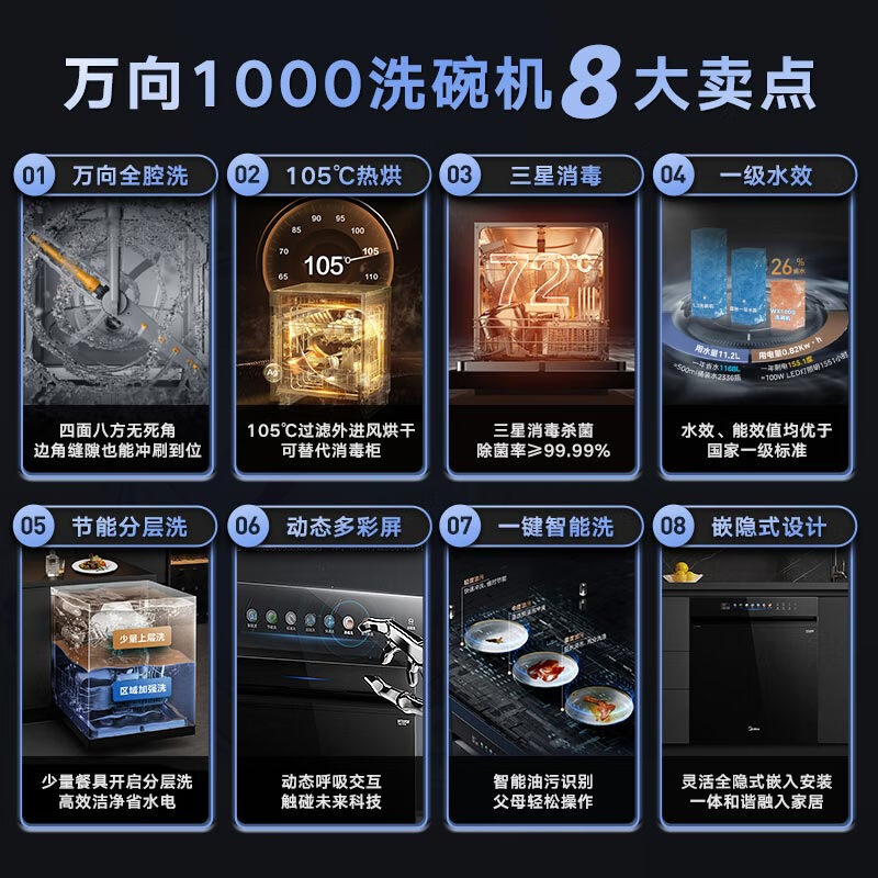 美的(Midea)万向1000洗碗机嵌入式14套大容量105℃热风烘干三星消毒一级水效分层洗智能洗万向全腔洗一体机价格:4499.00元!
