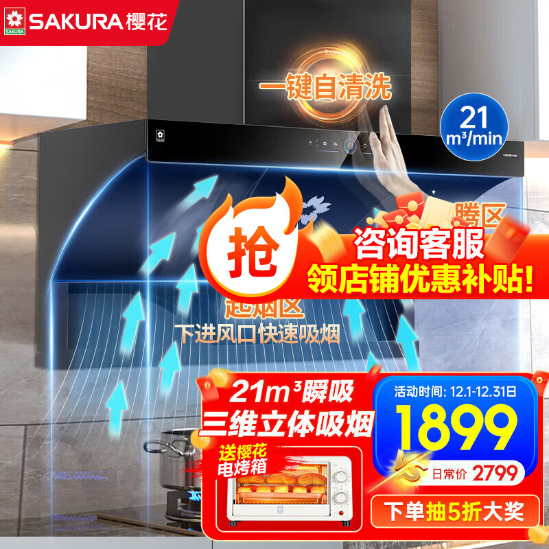 樱花(SAKURA)抽油烟机家用侧吸抽烟机挥手智控21立方大风量大静压双曲面多维立体吸烟一键自清洗 CXW-280-PJC03价格:1899.00元!