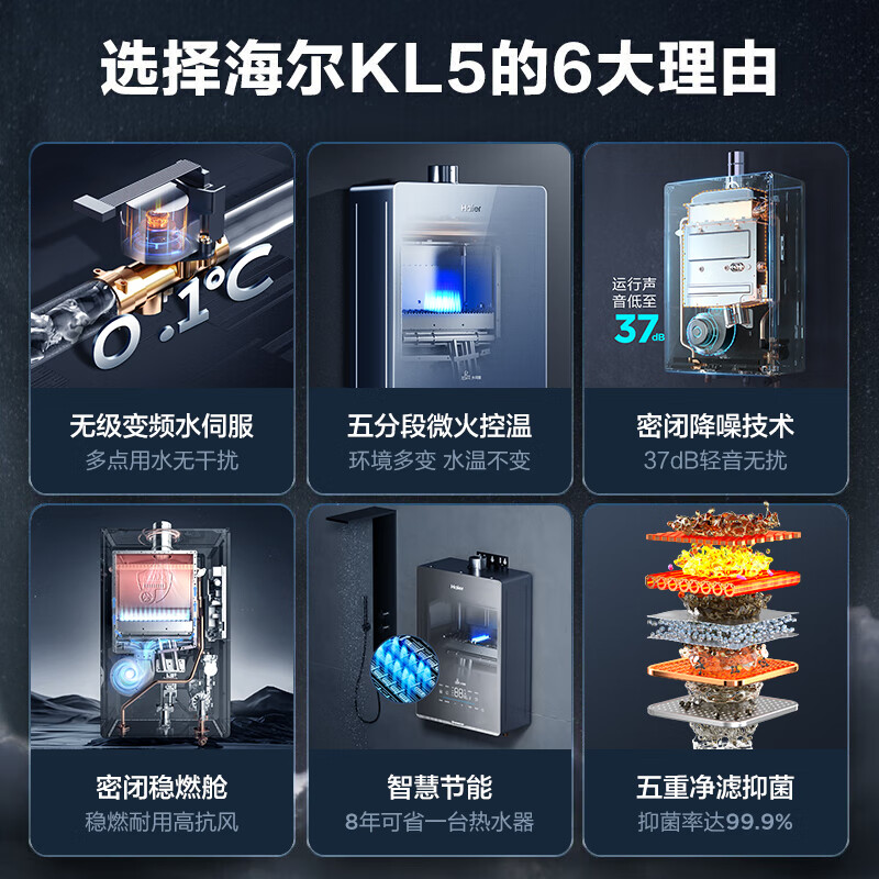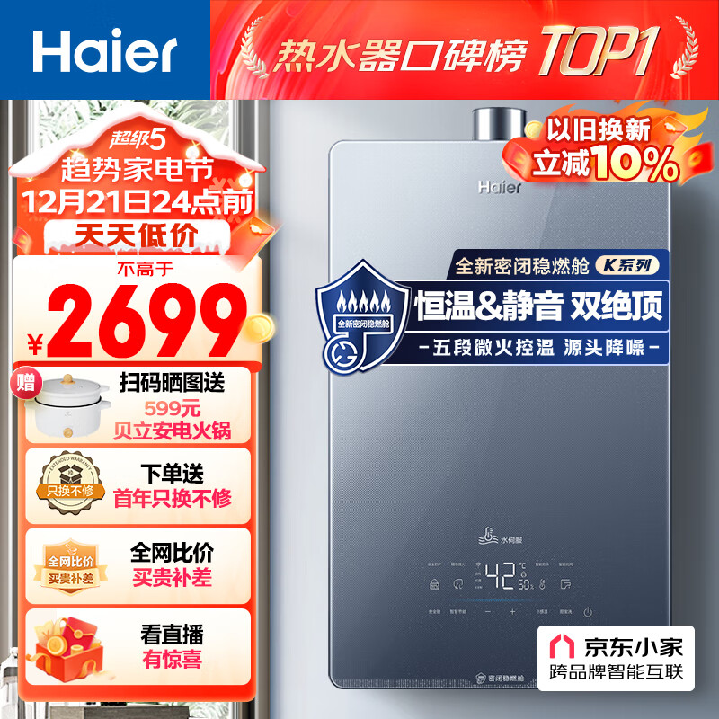 海尔(Haier)16升燃气热水器天然气 无级变频水伺服 五段微火控温 一级静音 全新密闭稳燃舱JSQ31-16KL5锦绣U1价格:2899.00元!