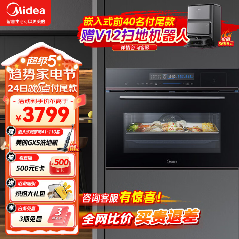 美的(Midea)嵌入式蒸烤一体机 家用智能多功能蒸箱烤箱二合一 京东小家APP操控 55L大容量搪瓷内胆 BS5051W价格:3799.00元!