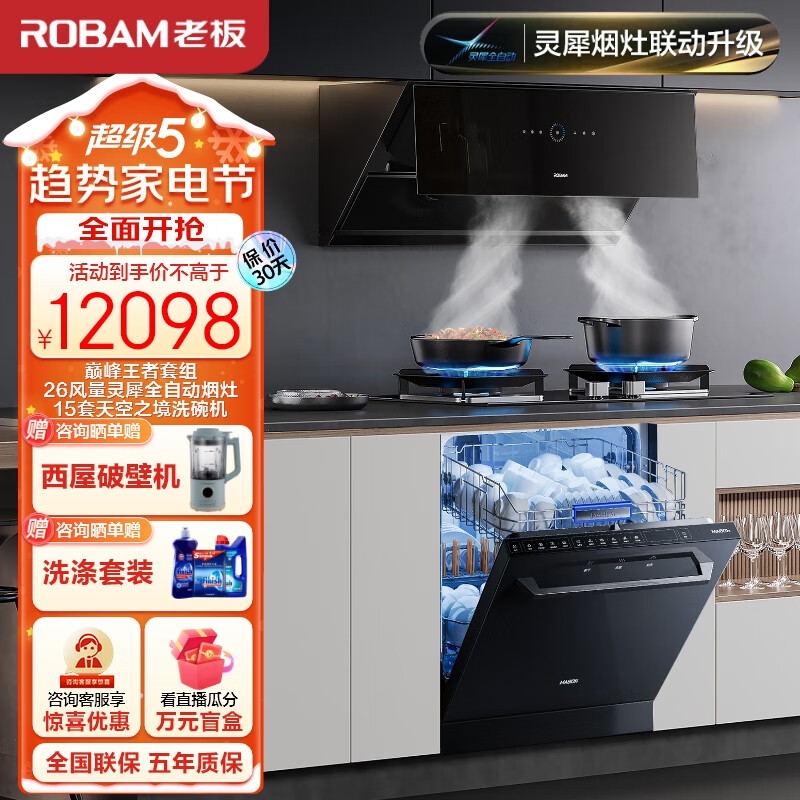老板(Robam)灵犀全自动烟机26风量侧吸变频抽油烟机燃气灶灶具15套洗碗机厨房多件套 29A9S+57B6DT+F80D黑价格:12098.00元!