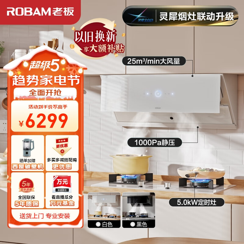 老板(Robam)【灵犀烟灶联动升级】抽油烟机变频家用25风量侧吸烟机燃气灶烟灶套装白色29X8SW+37B8XW(天然气)价格:6299.00元!