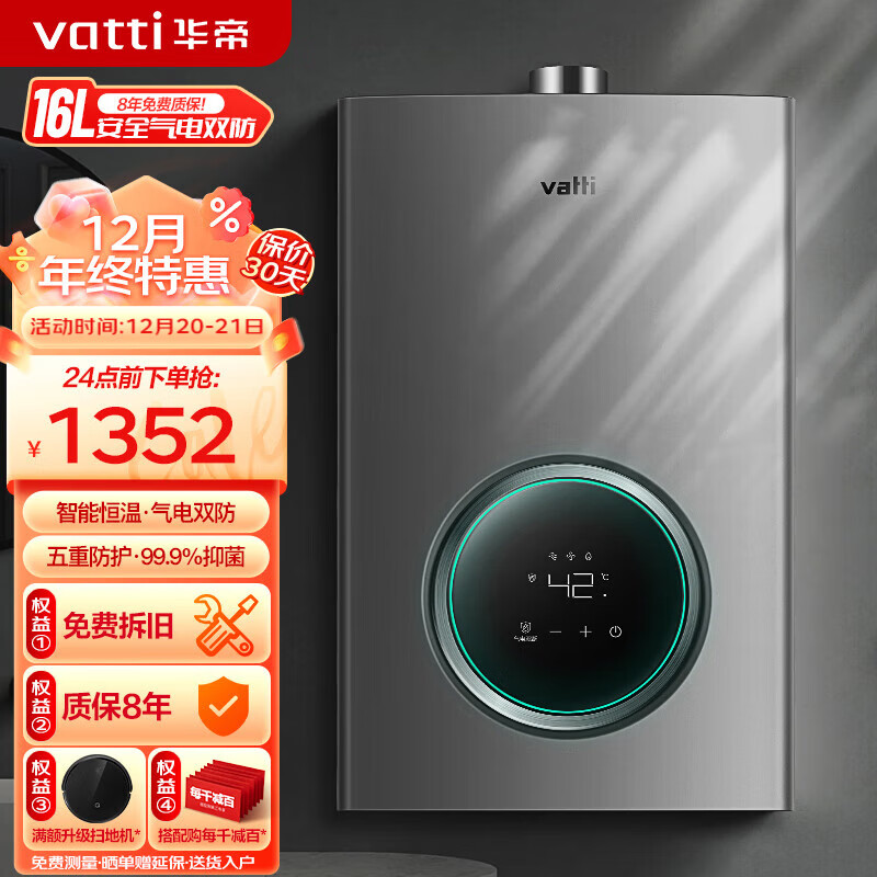 华帝(VATTI)燃气热水器 气电双断防护 恒温强排 即热式热水器 防燃气泄漏保护 低水压启动 【一厨多卫】i12103-16升 液化气价格:1399.00元!