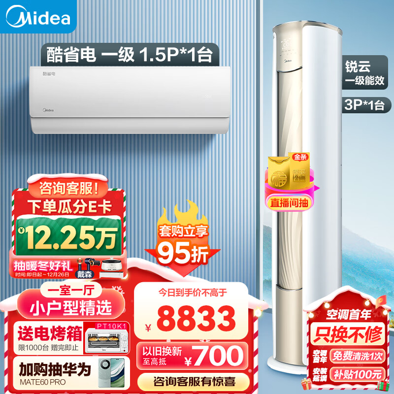 美的(Midea)新一级能效 空调套装 一室一厅 小户型精选(1.5匹酷省电+3匹锐云)价格:9298.00元!