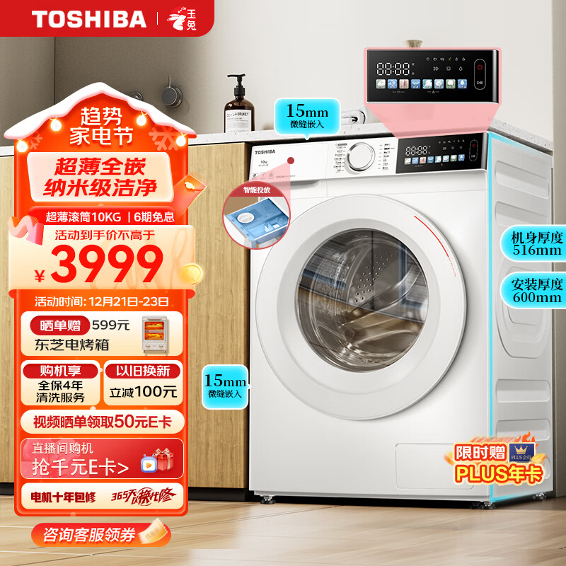 东芝(TOSHIBA)滚筒洗衣机全自动【玉兔单洗DG-10T13BF】超薄全嵌 10公斤大容量 智能投放 彩屏 BLDC变频电机价格:4399.00元!