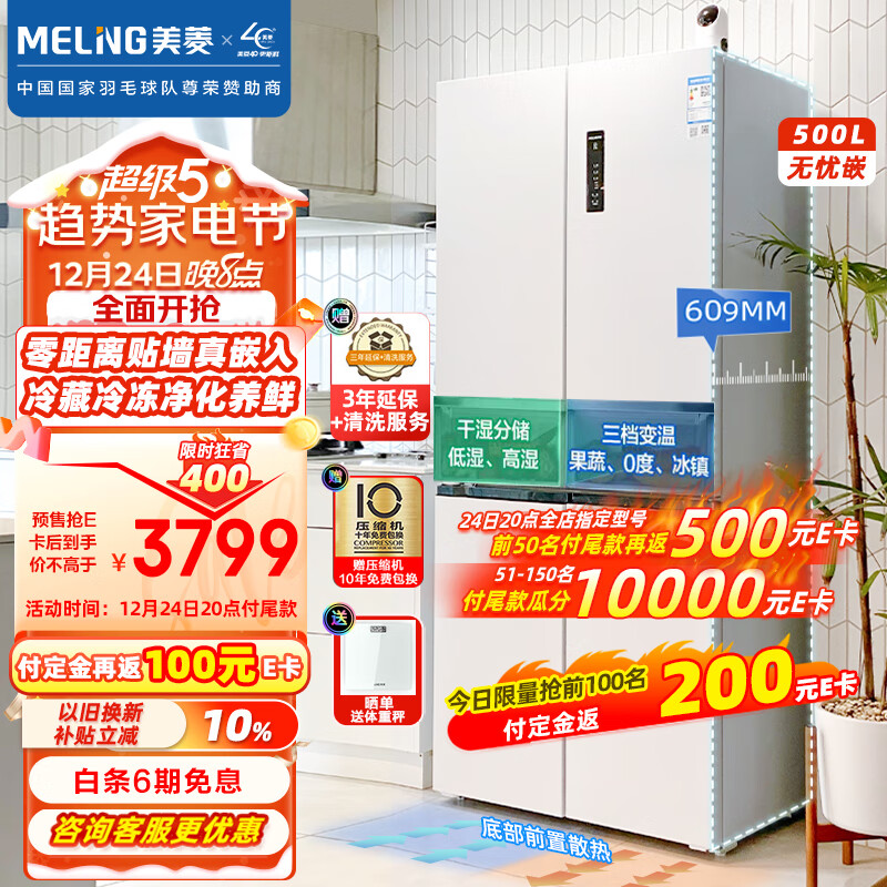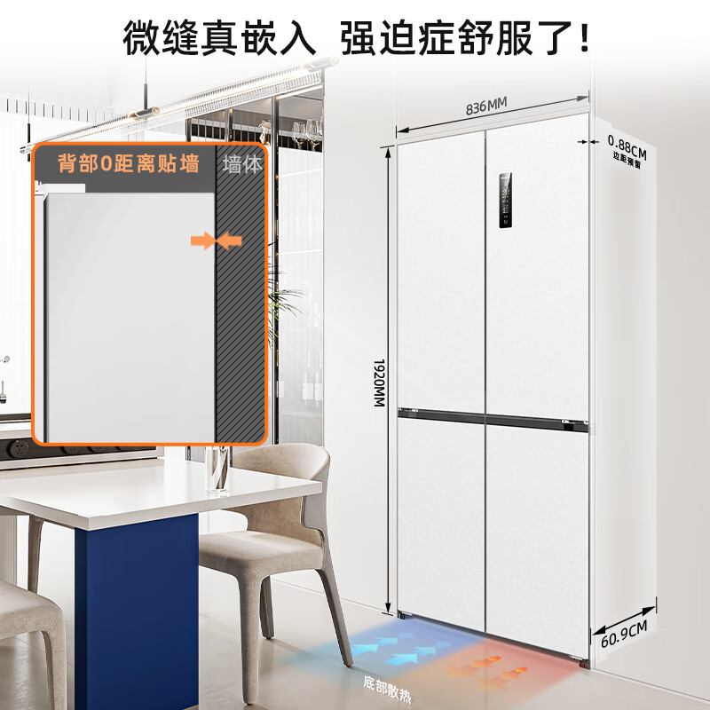 美菱(MeiLing)【无忧嵌】500升十字对开四开门超薄可嵌入式冰箱 家用变频一级能效BCD-500WPU9CX【501青春款】价格:3998.00元!