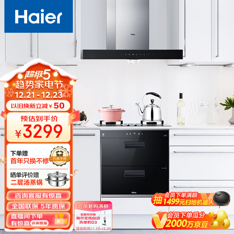 海尔(Haier)厨房三件套 抽油烟机21m3/min大吸力5.2kW超大火力100L大容量光波巴氏物理消毒T11+Q2BE3(天)+S8价格:3299.00元!
