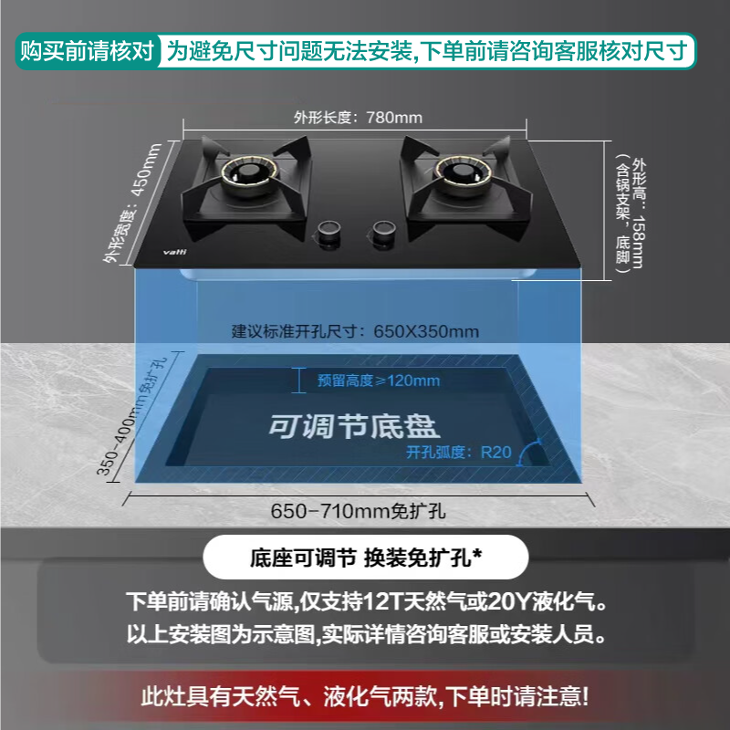 灶具台面尺寸:750±20mm