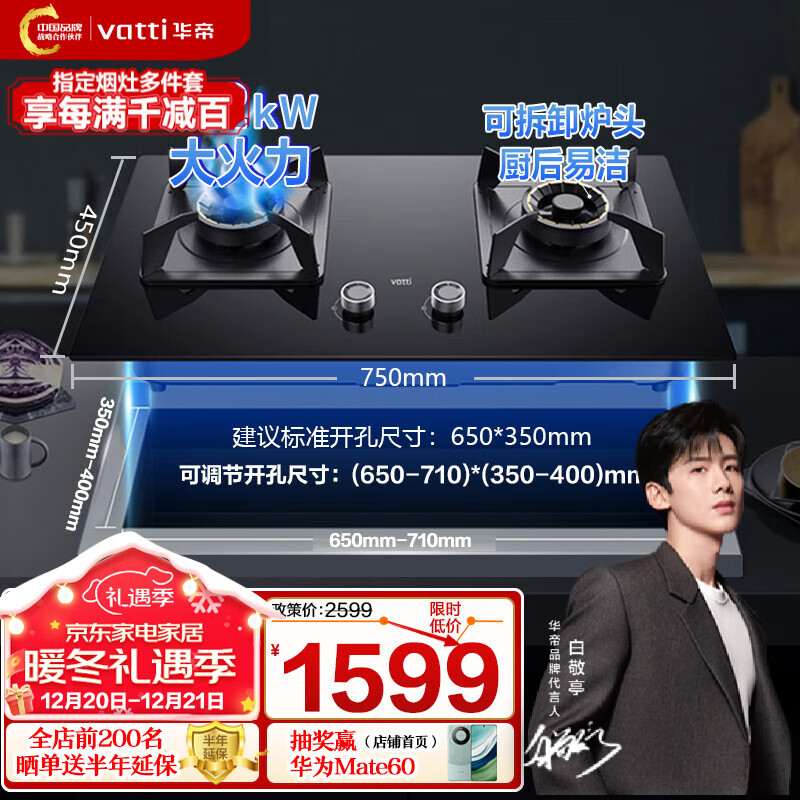 华帝(VATTI)i10075B燃气灶华帝官方5.2kw火力灶具台嵌两用一级能效可拆卸炉头可调节安装开孔尺寸钢化玻璃 天然气5.2kW价格:2299.00元!
