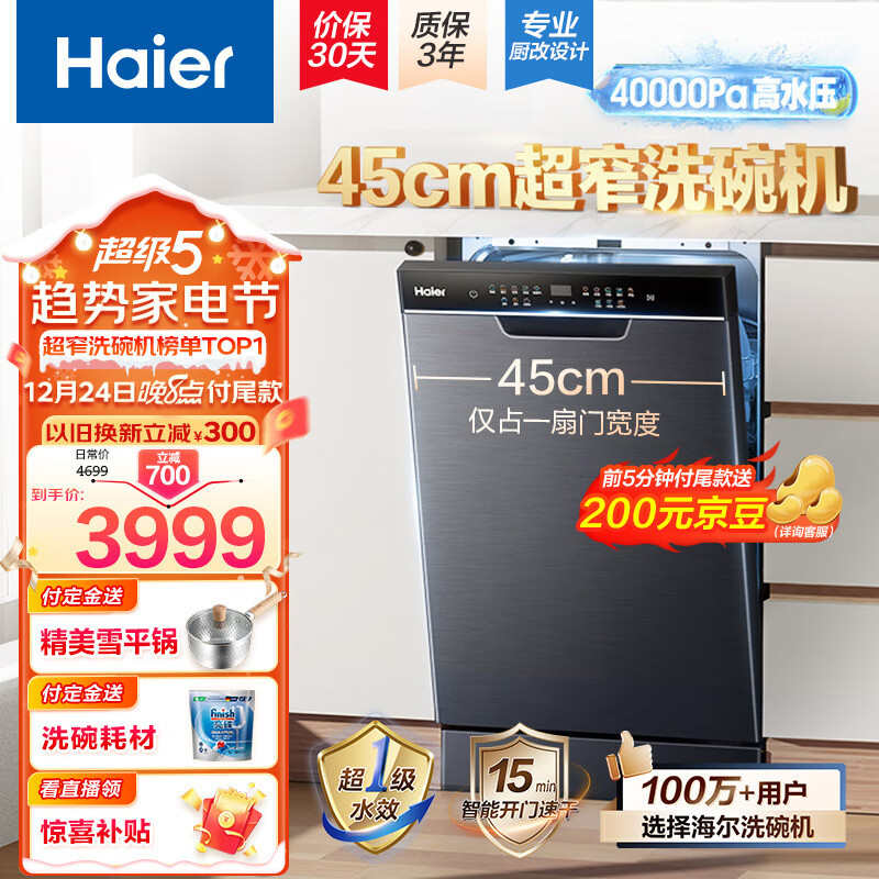 海尔(Haier)12套嵌入式变频洗碗机X3000洗消一体 一级水效 45cm超窄宽度 分区精洗EYBW122286BKU1价格:3999.00元!
