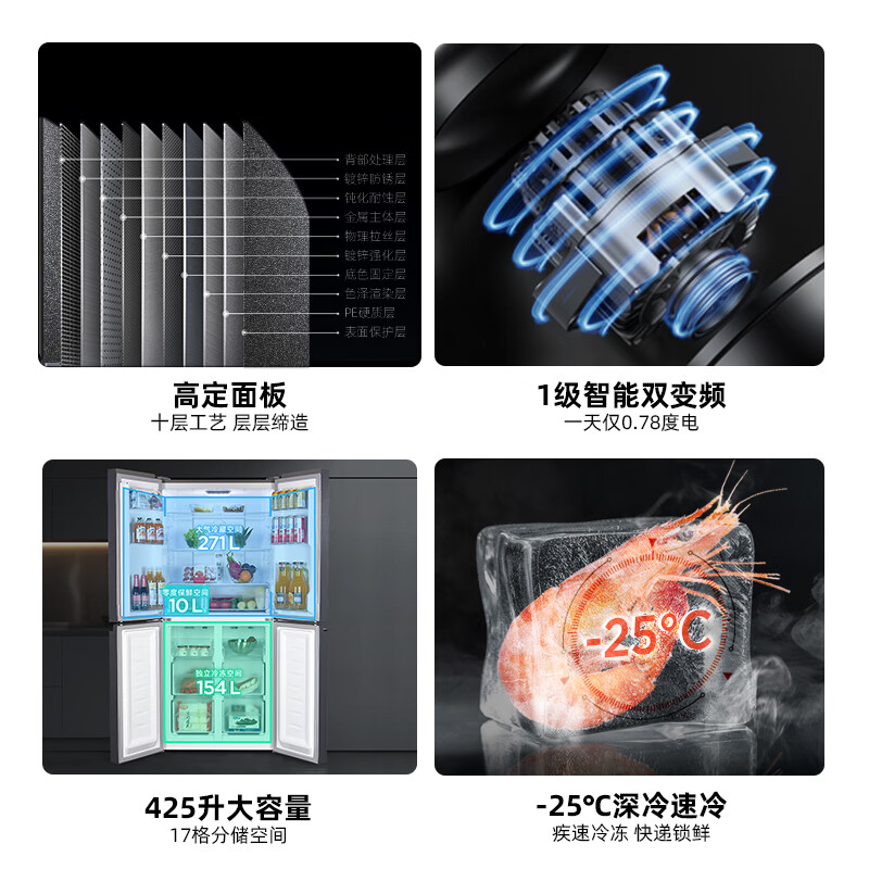 奥马(Homa)欧洲臻品425升大容量风冷无霜十字对开门四开门家用电冰箱 一级变频 净味除菌 BCD-425WDH/B价格:2179.00元!